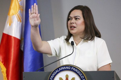 मनिलामा प्रेस सम्मेलनमा बोल्दा फिलिपिन्सका उपाध्यक्ष सारा, फिलिपिन्स फेब्रुअरी। (एपी)