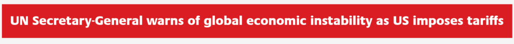 न्यू योर्क, अमेरिका – संयुक्त राष्ट्र महासचिव महासंघका एन्टी फस्टोररेसले अधिकांश देशहरूबाट आयातमा प्रतिराम शुल्क पारस्परिक शुल्कहरू कार्यान्वयन गर्ने वैश्विक व्यापार युद्धको बढ्दो खतराको बारेमा चेतावनी दिएको छ। “कुनै पनि ट्रेड युद्धमा जीतिएन,” पेटर्नेरेसले भने, विश्वव्यापी आर्थिक स्थिरतालाई भंग गर्ने क्रममा सावधानी अपनाउने बिरूद्ध अवरुद्ध।