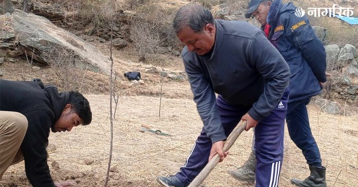 नेकपाको केन्द्रीय कार्यालयको आयोजनामा भएको कार्यक्रममा करिब १३ हजार वर्गमिटर क्षेत्रफलमा २ हजार स्याउका बिरुवा तथा ४ सय दाँते ओखरका बिरुवा रोपिएको छ।
