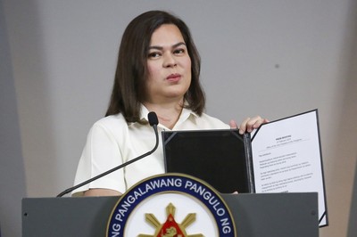 फिलिपिन्सका उपाध्यक्ष सारा dunte ले उनको बयानको एक प्रति समात्छिन् जब उनले मनिलामा प्रेस सम्मेलनमा बोल्छिन्, फेब्रुअरी on मा फिलिपिन्स। (एपी)