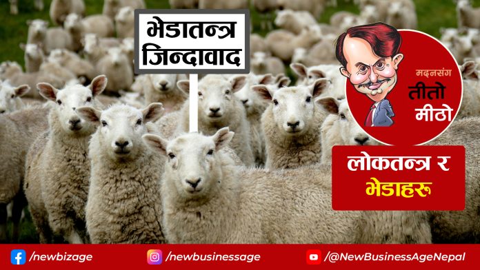 भेडाको आँखा हुन्छ, तर पढ्दैन । दिमाग हुन्छ, तर सोच्दैन । मुख मात्रै चलाउँछ– ‘भ्या–भ्या’ । ‘हामीलाई स्वतन्त्रता चाहियो’ भन्दै भेडाहरूले गरिरहेका प्रदर्शन हेर्दा, लाग्छ– लोकतन्त्रले भेडाहरूमा पनि राजनीतिक चेतना भरिदिएको छ ।