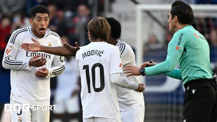 स्पेनिश फुटबल संघ (आरएफएफ) रिफेरी जोस Mamnera mununeher जून बेल Bellingham लाई पठाउने निर्णय पछि “घृणित” दुरुपयोगको निन्दा गरेको छ।